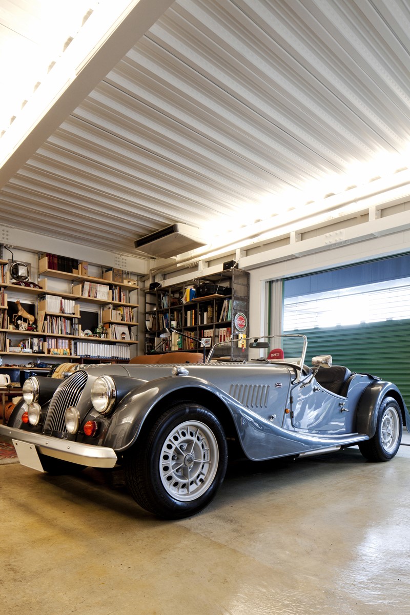 近藤さんのクルマ愛が伝わってくるガレージライフ。好きなものに囲まれて暮らすという、男ならではの夢がかなった、心が満たされる空間である。モーガンのシートに座って映画を味わうなんてそうそうできることじゃありません!
