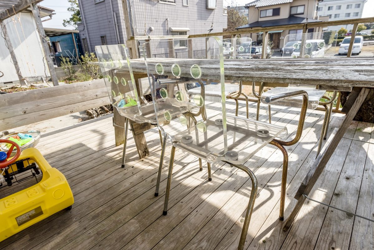 ダイニングキッチンからつながる自作のデッキスペース。椅子はアクリルブームのときに制作したオリジナル作品で、当時かなり人気の商品だったそう。