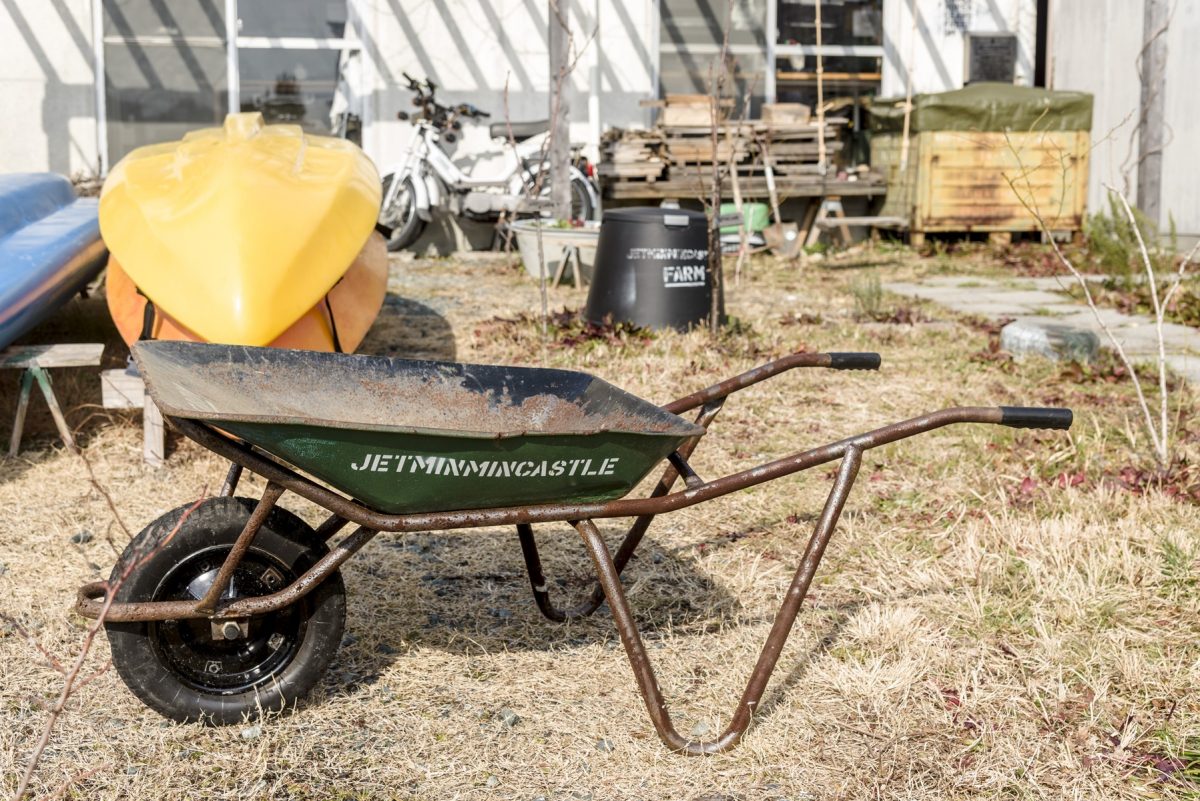 こちらは廃屋に残されていた一輪車。かなりボロボロだったものをペイントし直し、これ以上錆びないように錆止めを施した。庭造りに役立っている。