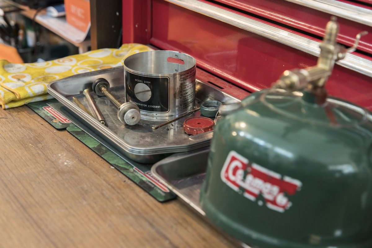 ビブラントの大きな魅力が、コールマンのランタンのオーバーホールや修理を行ってくること。ヴィンテージでも現行でも基本的な構造が変わらず、多くのアフターパーツが手に入るので、故障しても直せることがほとんどだとか。パーツの取り寄せで時間がかかるモデルもあるが、石角さんの手にかかればどんなランタンでも直ってしまう。困った時は、まず相談してみよう!