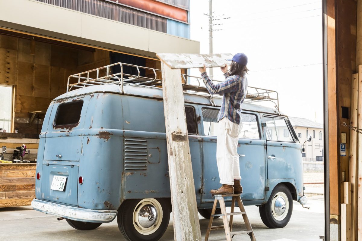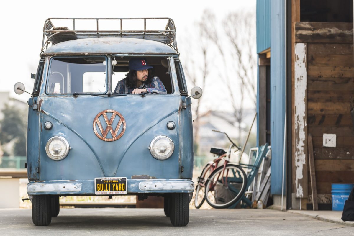 ルーフラックに旧い木材を積んでバイアスタイヤのまま走り回るカサカサボディのタイプ2。まるで過去からタイムスリップしてきたような旧いクルマで日々東奔西走しているのは、「BulliYard(ブリヤード)」のりゅうじろうさん。仕事現場への移動や資材の運搬に’58年式のタイプ2を愛用している。