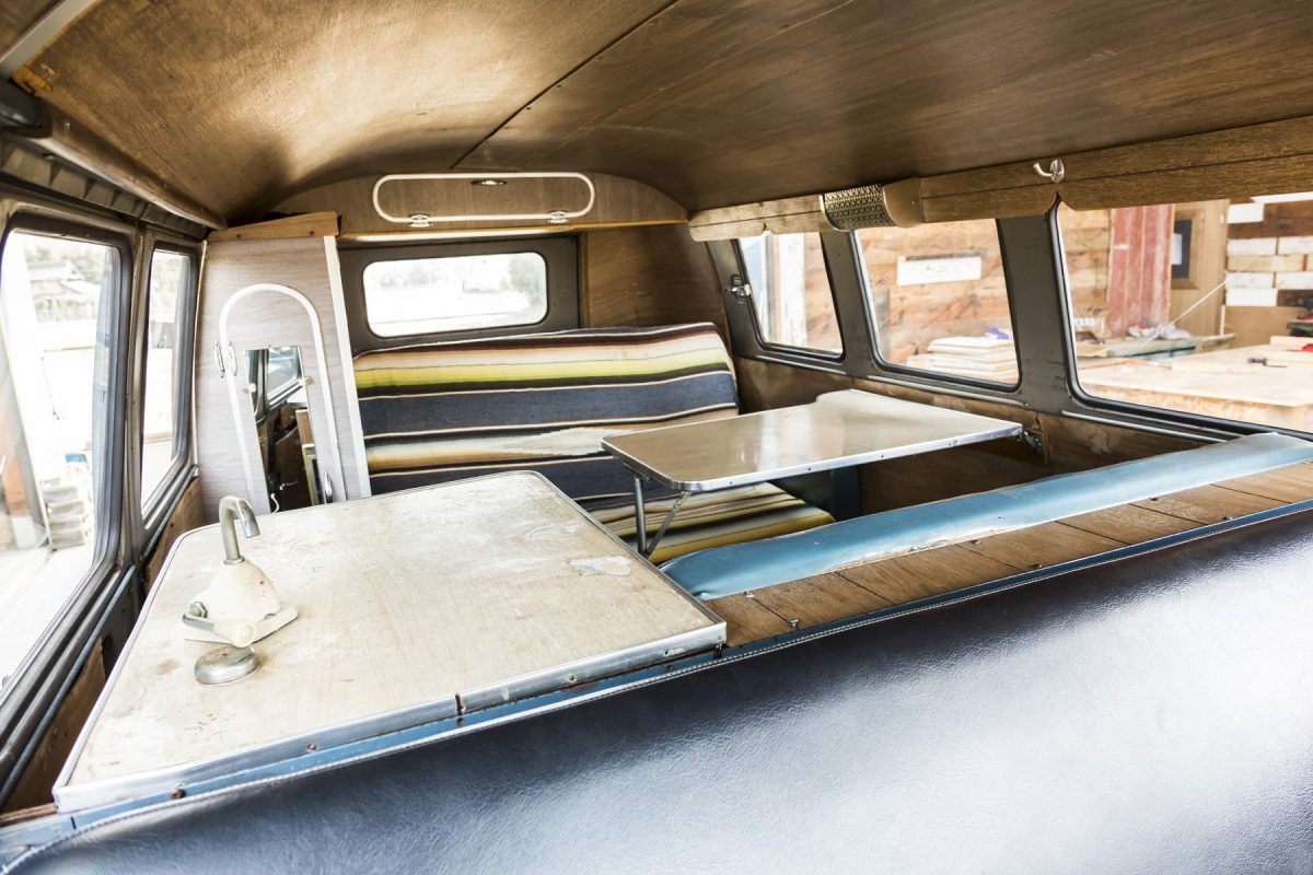 58年式コンビをベースにアメリカでカリフォルニアロードランナーキャンパーの内装を架装した個体。カサカサなボディは、たまにサンドペーパーでサビ落としが必要なんだとか。