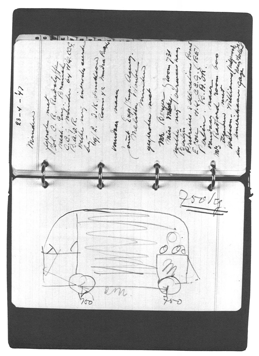 当初はその構内車の輸入を試みるが、安全面の問題からそのまま輸入することは叶わなかった。そこで占領下の英国人将校に直談判し、商用車の必要性を説き、開発を依頼した。その時に手帳に描いた走り書きが現在のトランスポーターの原型となっているのだ。