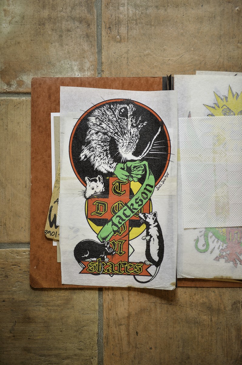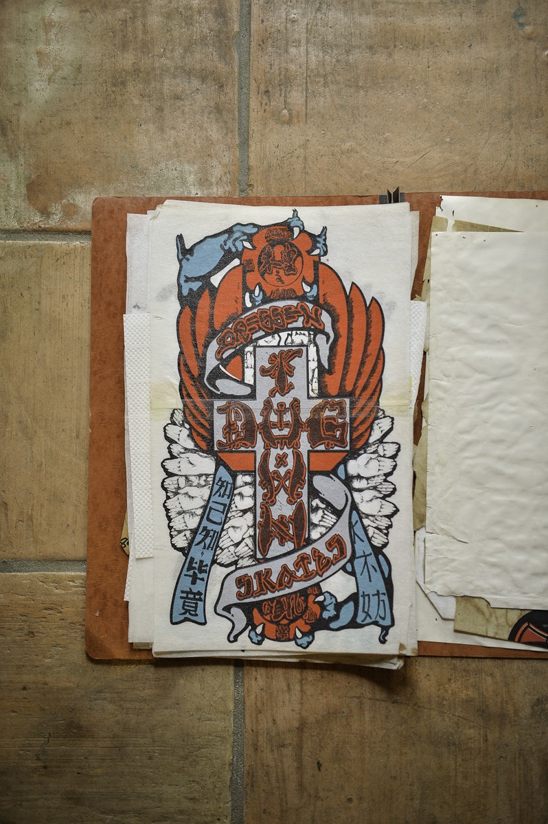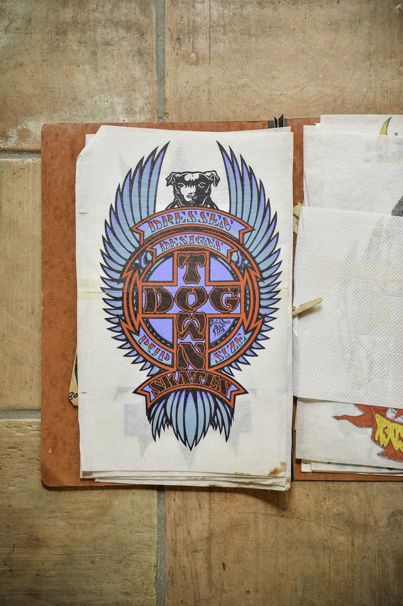 オフィスには世界のDOGTOWN 好きが自分でデザインしたものが届くことが多いそうで、これもそのひとつ。気に入ったものはこうして大切に保管している。