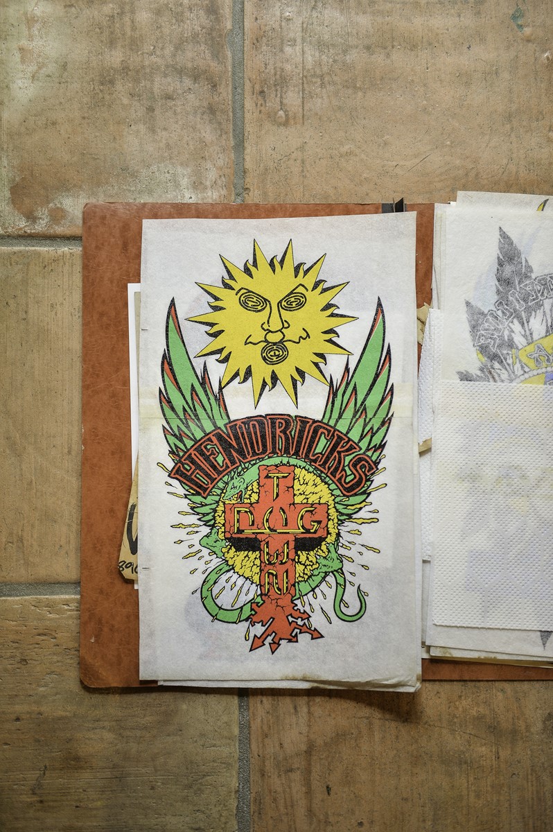 Tシャツにシルクスクリーンプリントを施すための試し刷りの版。所属ライダーだったエリック・ドレッセンやアーロン・マーレー、ティム・ジャクソンなど、そうそうたる顔ぶれが並ぶ。