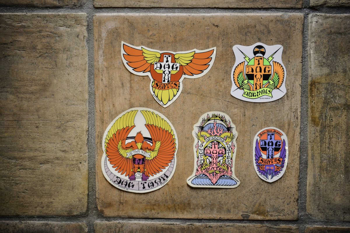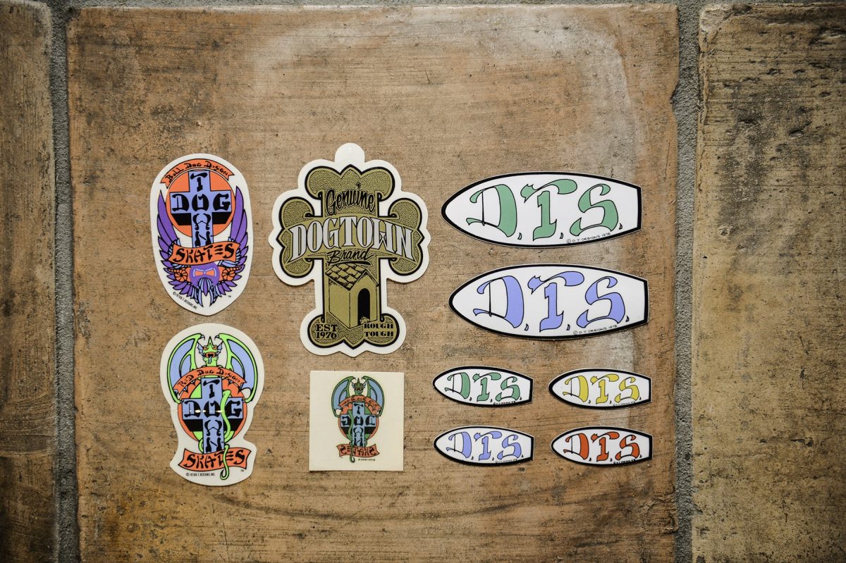 1970〜’80年代当時のデッドストックもある貴重なステッカー。グラフィックはほぼブルドッグアート(ブランド創設者のひとりであり、メンバー達のデッキをデザインしたオリジナルアーティストであるウェス・ハンプストン)ながら、“Genuine DOGTOWN Brand”と描かれたものは別デザイナーによるもの。