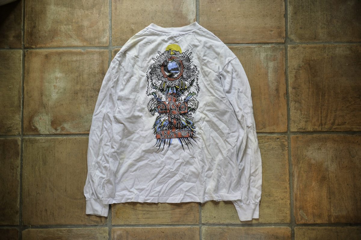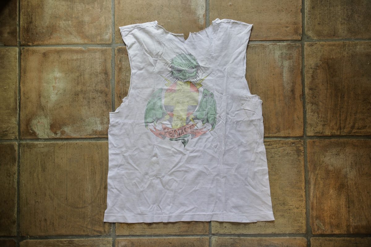 アーロン・マーレーモデルのロングスリーブ T シャツと、風合いのある擦れたプリントが特徴のノースリーブT シャツ。生地が部分的に破れても、このように自分で切ってカスタムして着ていたそうだ。