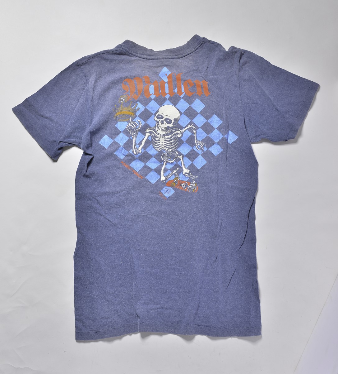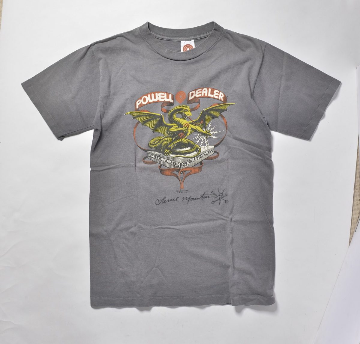 バナーと同じデザインがプリントされたPOWELL PERALTA のチームモデルのT シャツ。書かれたサインはライダーだったランス・マウンテンによるもの。