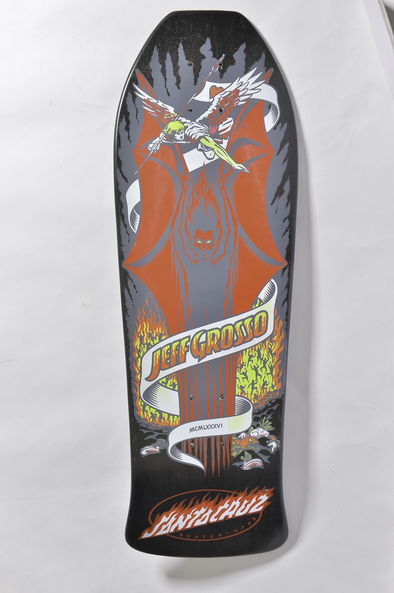 ノーズの先端をカットしたようなシェイプのジェフ・グロッソモデル。天使が人を襲う悪魔を縛り上げるグラフィックはジム・フィリップスによるもの。