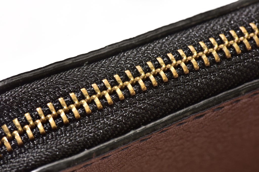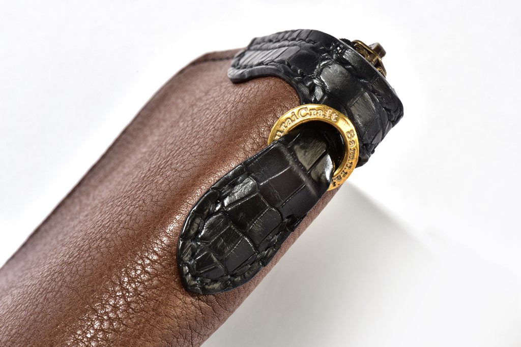 ウォレットチェーン接続部分の補強の革も選択可能。ハンドル部は、デザインのアクセントにもなるので、インパクトの強い革が欲しいところ。で、クロコダイルをチョイス。
