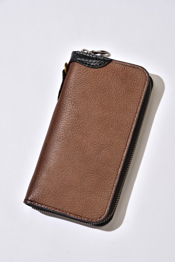 遂に完成したモヒカン小川仕様のサムライウォレット。シュリンクレザーのシボ感と、ハンドル部分のクロコダイルのコントラストが、たまらなくいい感じ。秋冬は革しか着ないモヒカン小川だけに、革ジャンとのコーディネイトを考えてジッパーテープもブラックにした。