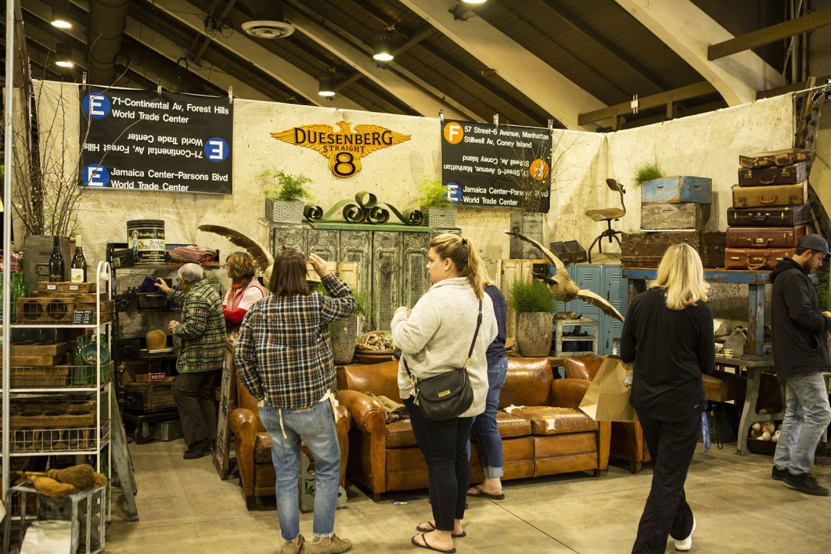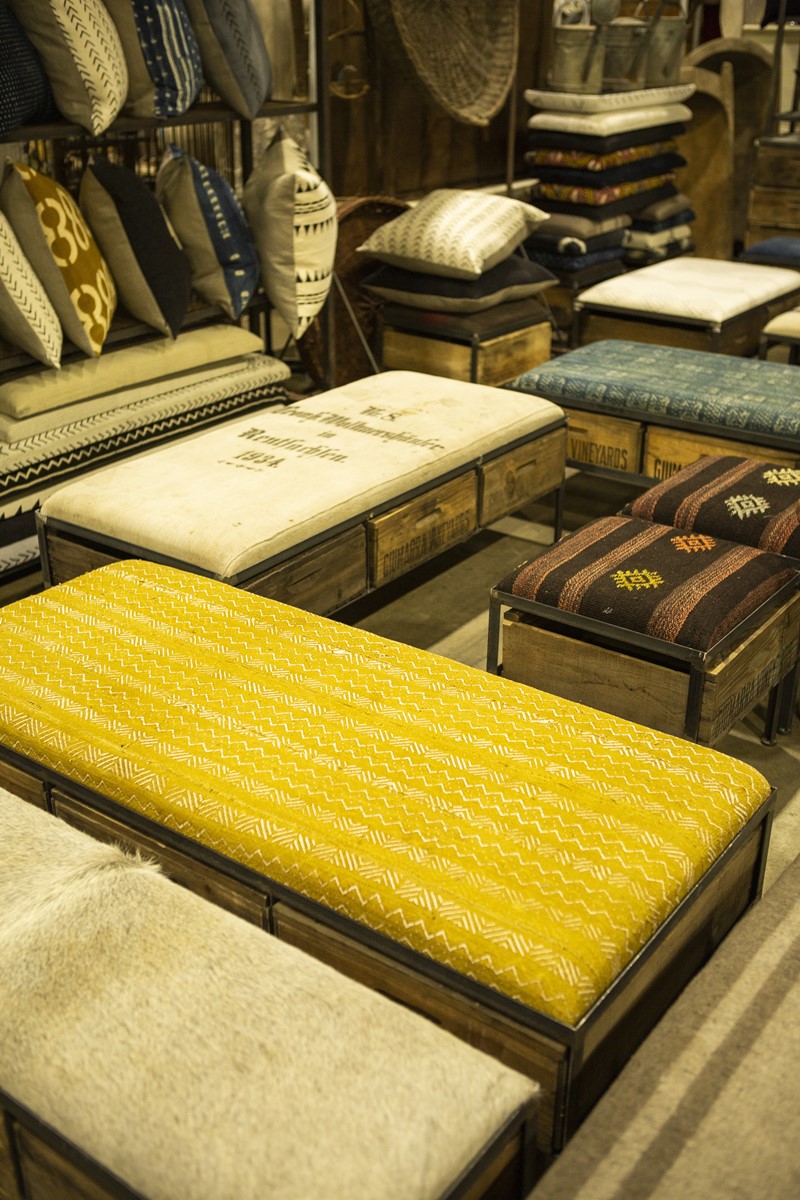 インダストリアルな雰囲気のベンチはアンティークではなく新品。アンティーク調でハンドメイド感のあるプロダクツを扱うメーカーやショップも出展する。