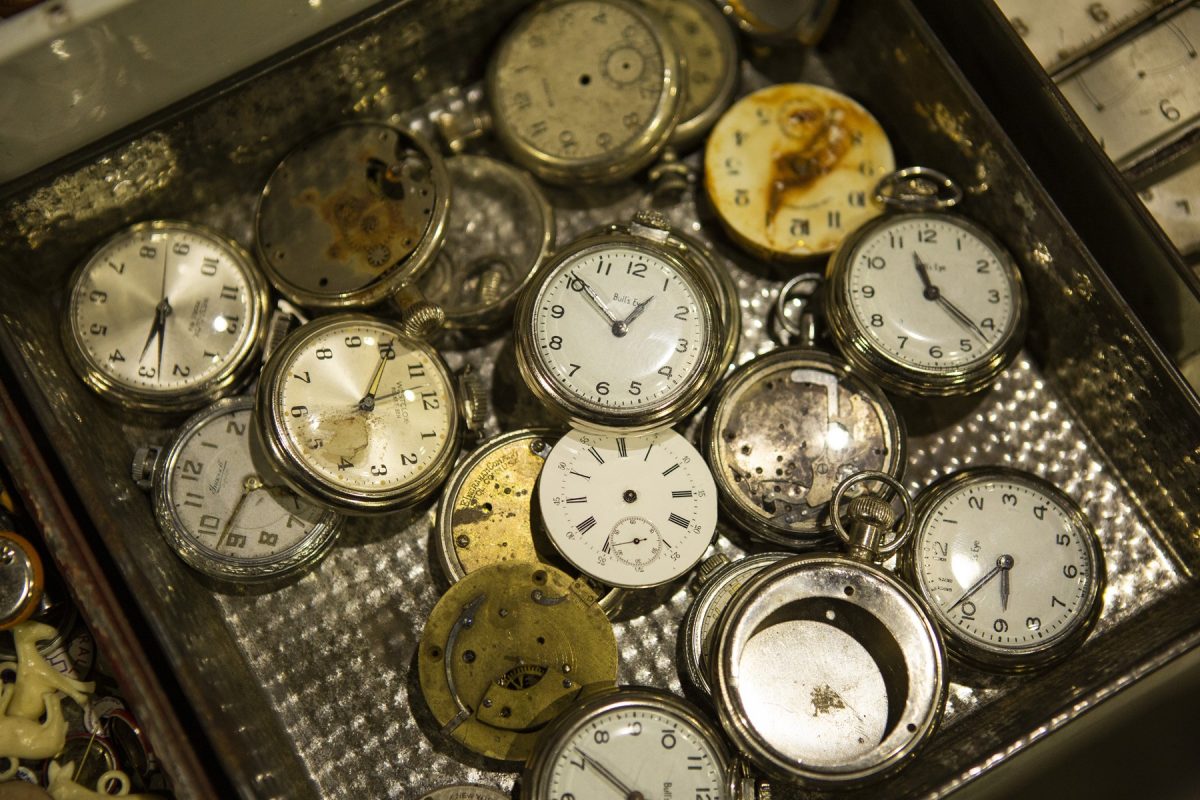 ジャンクという呼び方がふさわしい。バラバラになったパーツといっしょにディスプレイされる懐中時計たち(笑)。