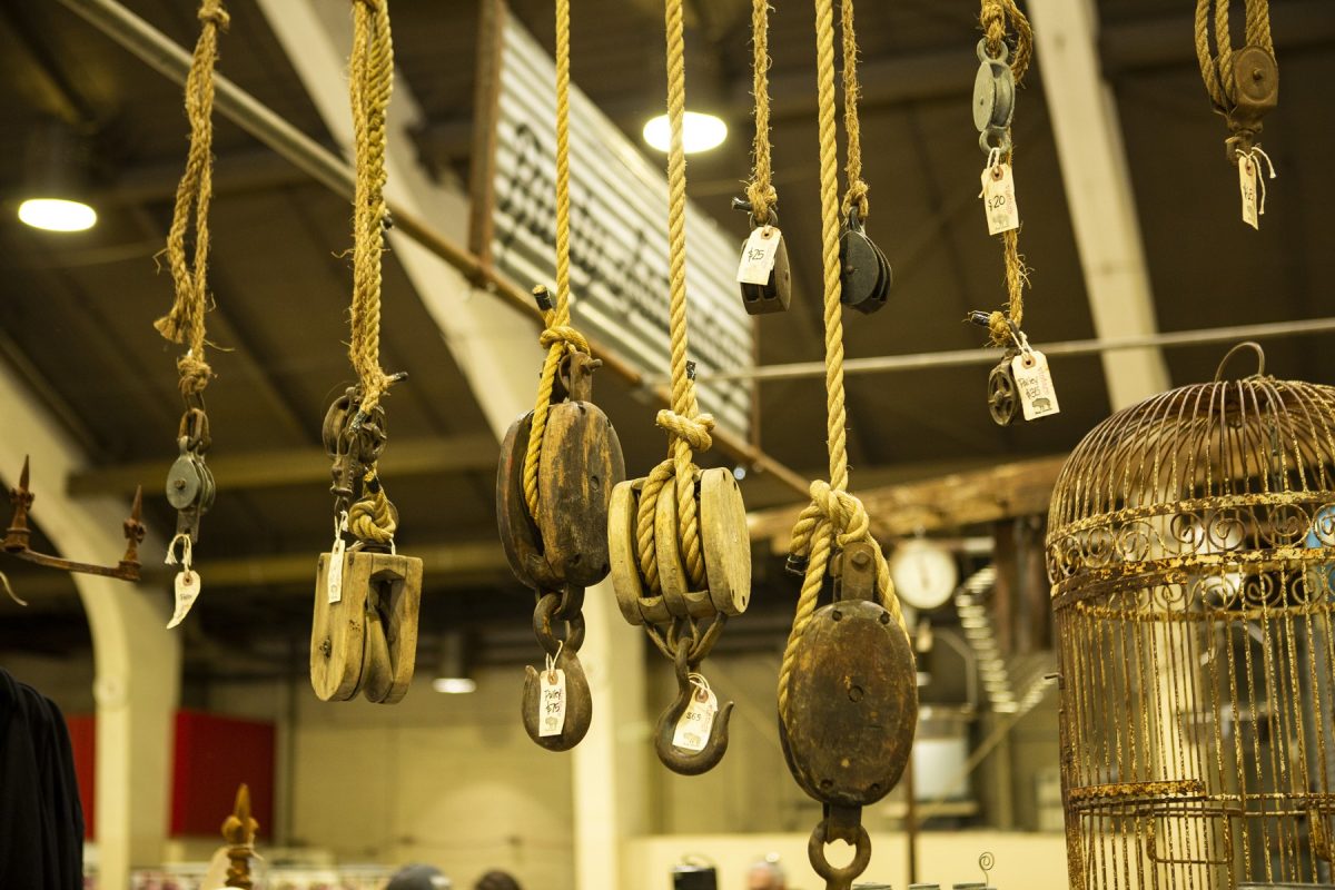 フック付きの滑車はかつて農場や工場などで使われていたインダストリアルなアイテムの代表。どれも50ドル以上。