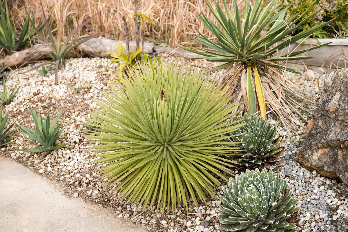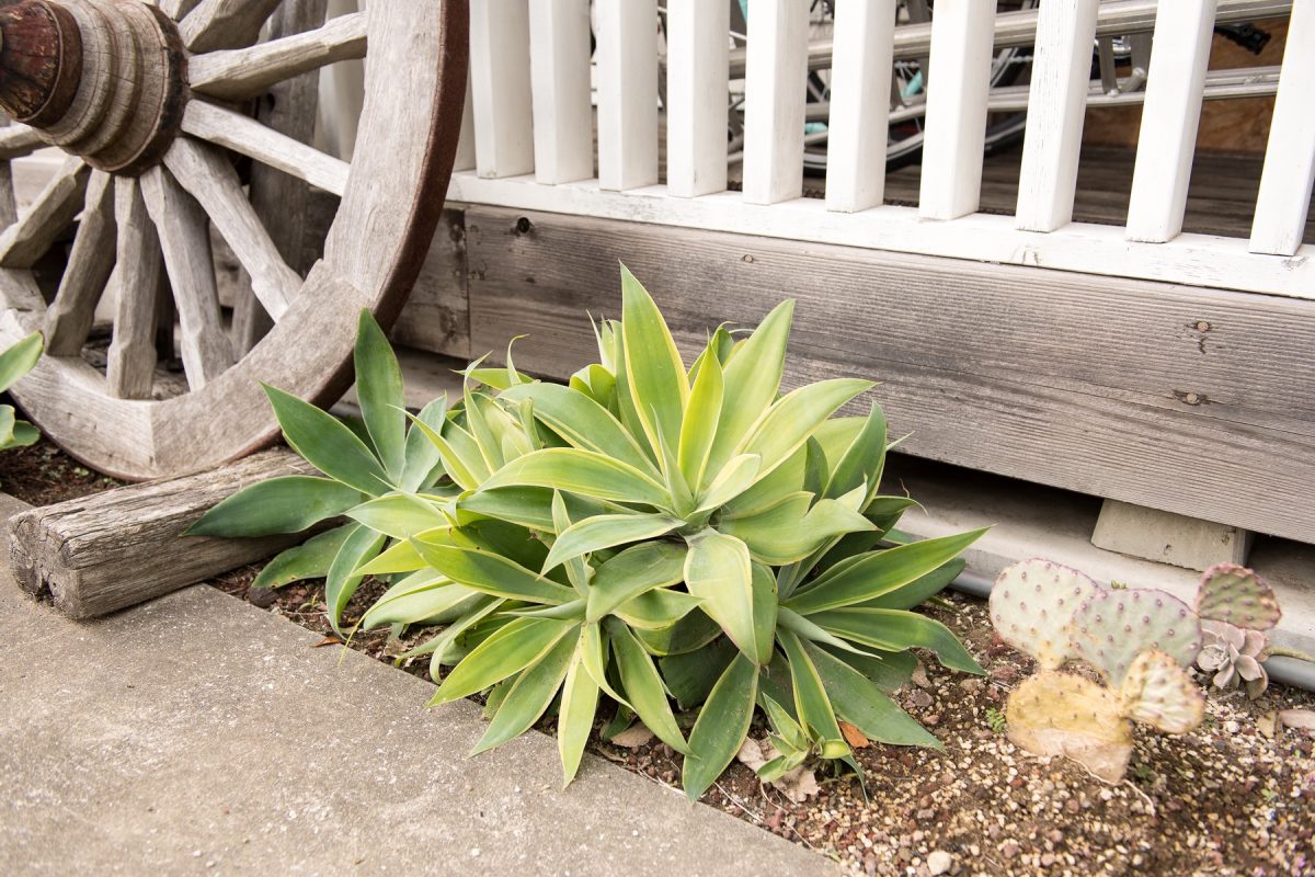 自生地はアメリカの南東部。アガベの中では唯一トゲがなく柔らかいイメージを持ち、南国風のスタイルに合う植物。未だに根強い人気で、花壇など人がよく触れるような場所に多く使われている。参考価格4500円/株