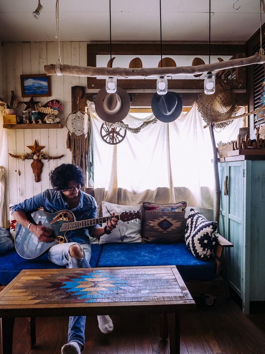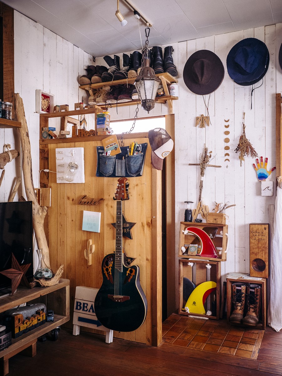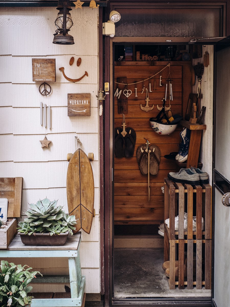 4年前、木工アーティストとして独立したときに移り住んできた横須賀。“海の見える家で、サーフボードをシェイプするのが夢”という村山じゅんさんは、築50年の昭和チックな平屋を借りて、趣味であるサーフィンや海をコンセプトに、壁からインテリアまですべて自分で作っている。