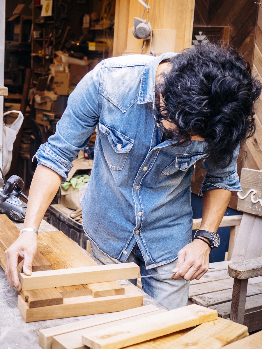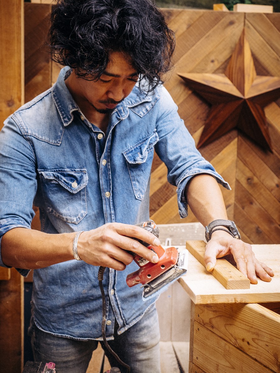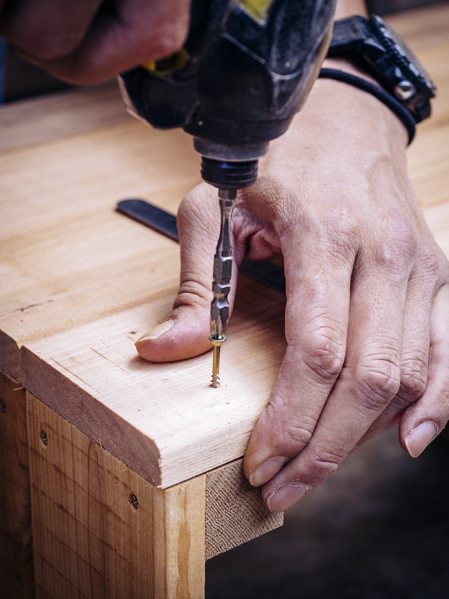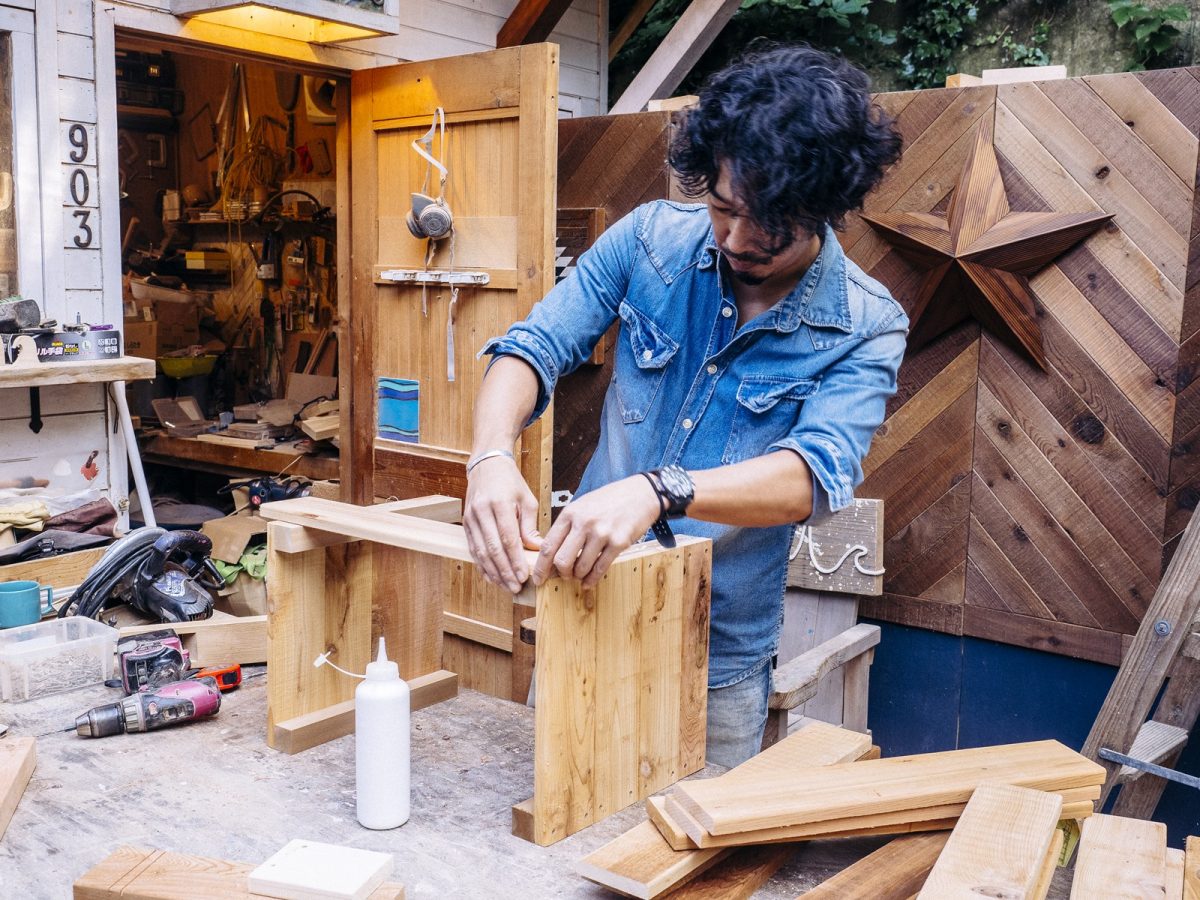 1×4材と角材をビスで留める。木工アーティストならではの細かな作業が光る。