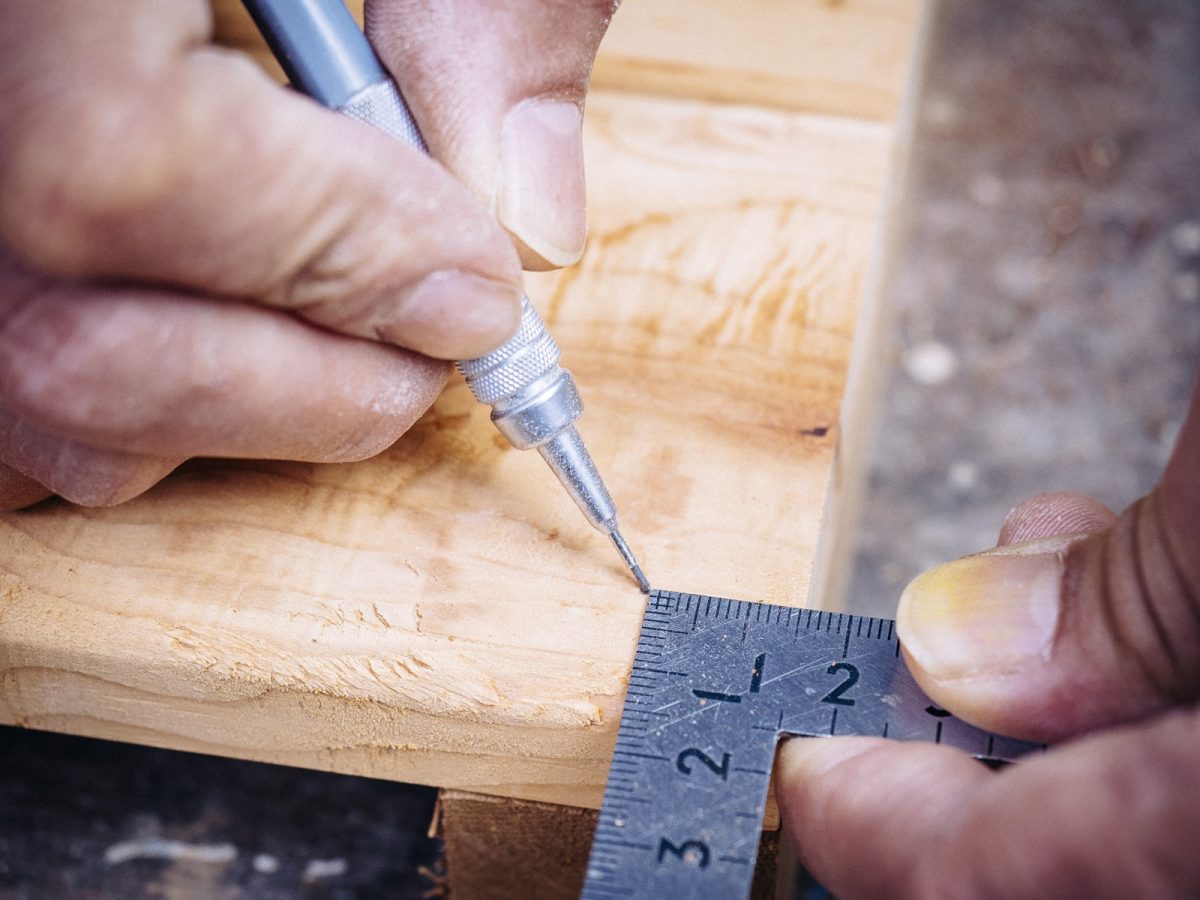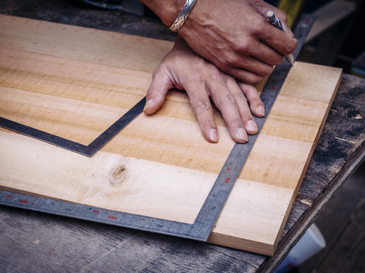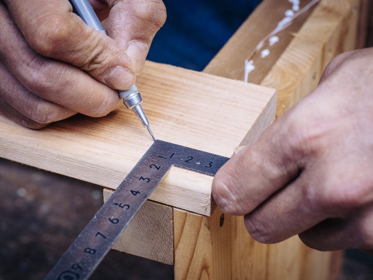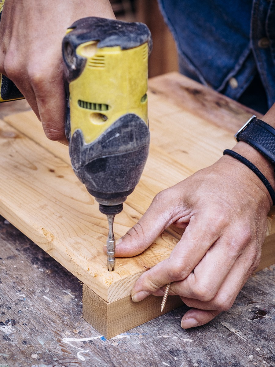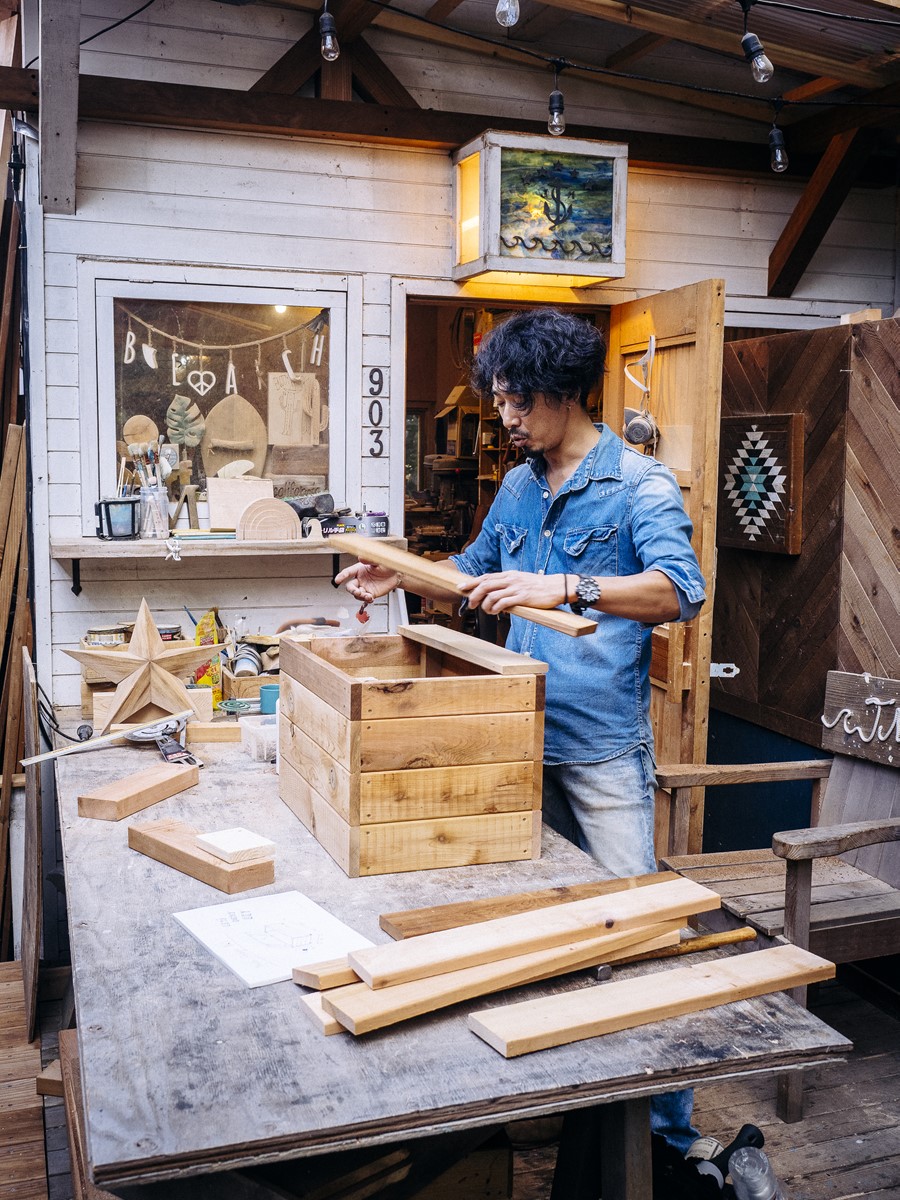1×4材と角材をビスで留める。木工アーティストならではの細かな作業が光る。