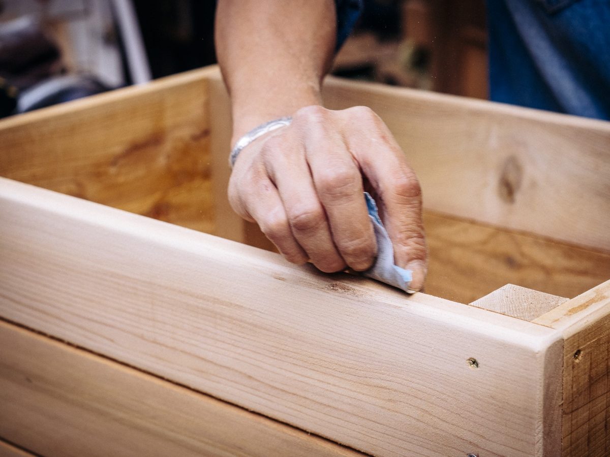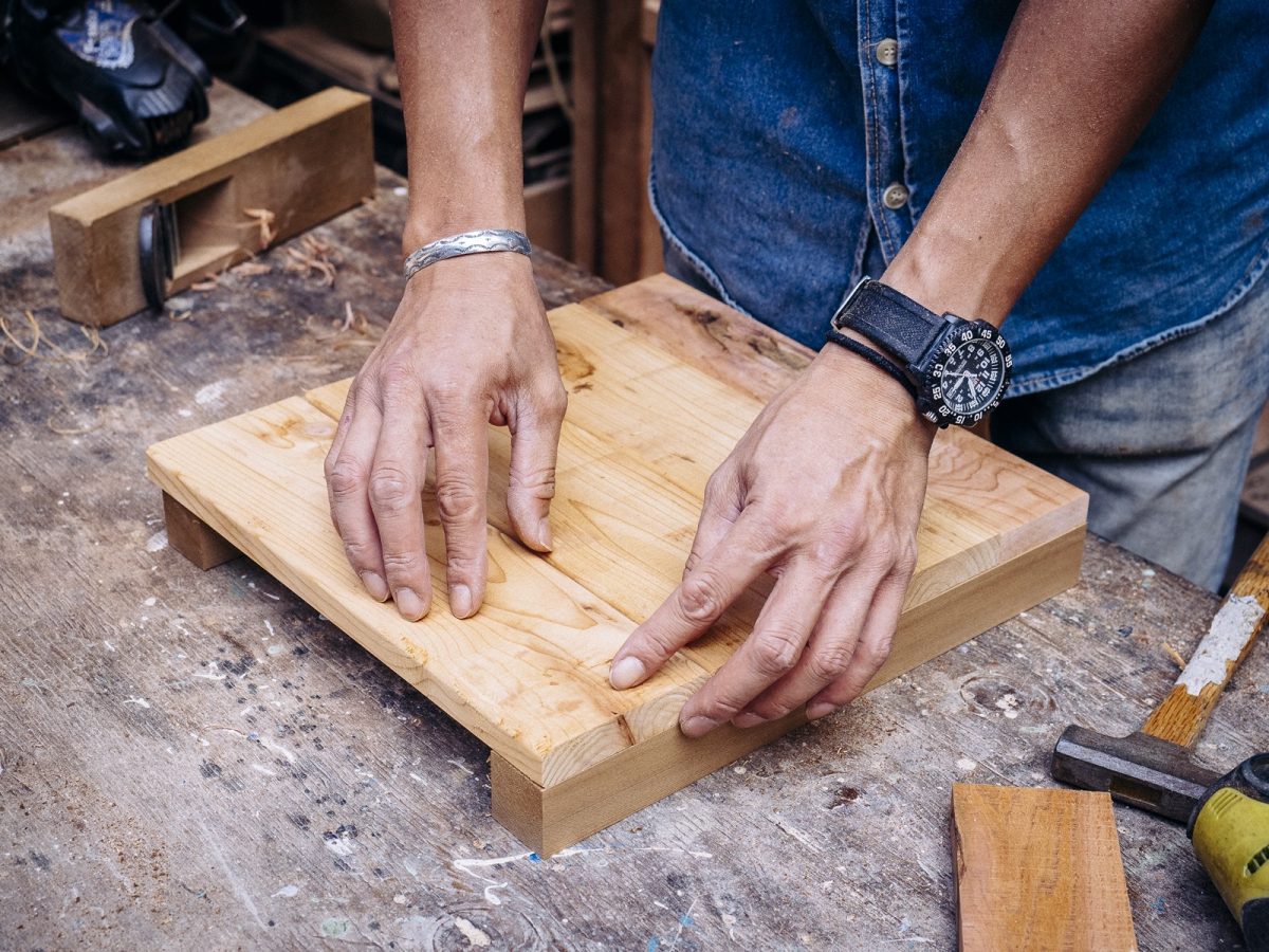 手順8〜10と同じように、角はカンナで丸みをつけて、そのあとサンディングして滑らかにする。仕上げに紙やすりを使ってより滑らかにしていこう。