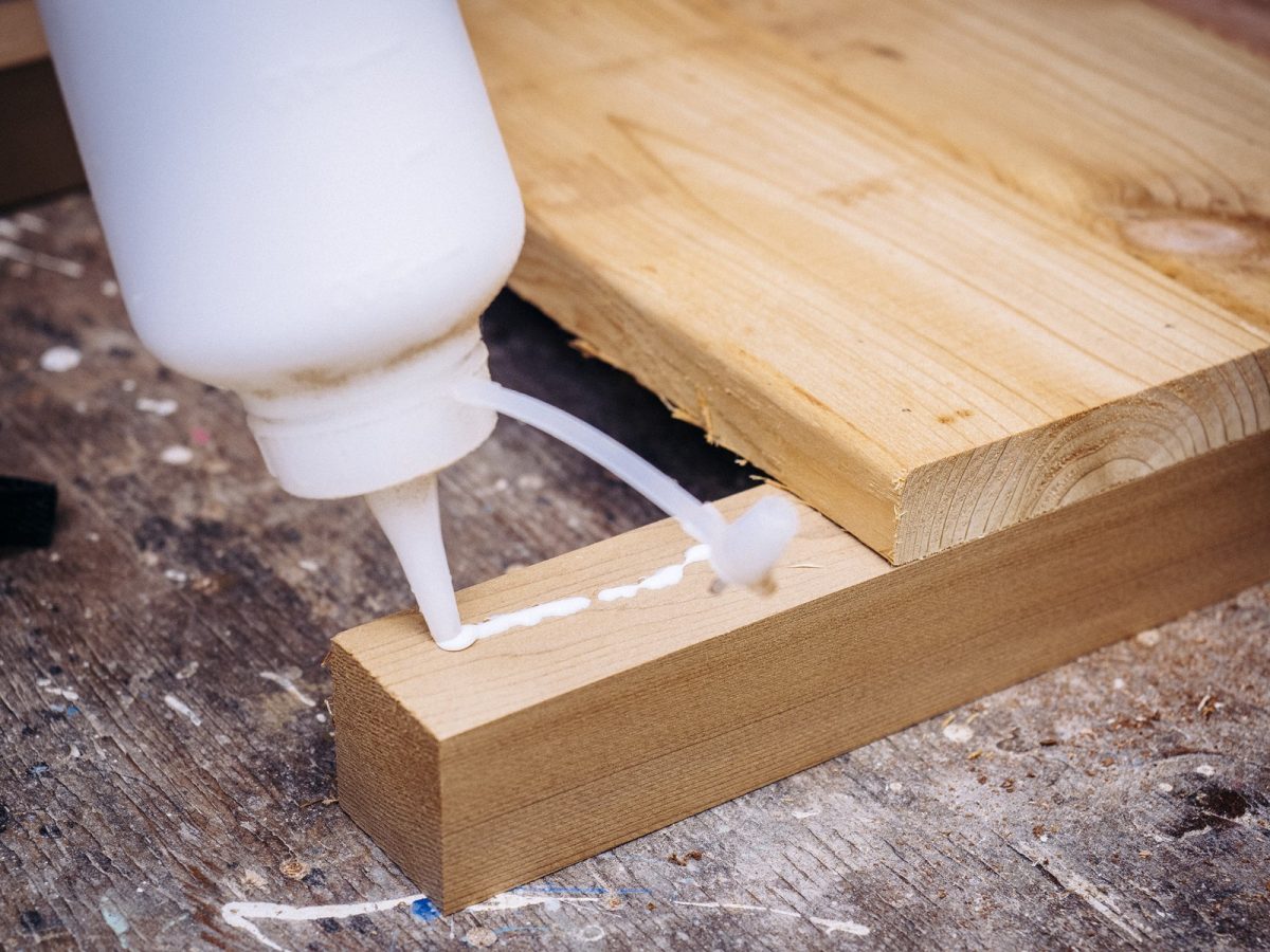 天面以外の面を木工用ボンドで固定しながら1×4材で組み立てていく。ビスを打つときは先に打ったビスが当たらないように、少しずらしながら打つようにしよう。