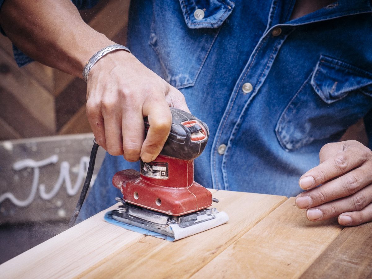 表面をサンディングする。電動サンダーを押しつけながら移動させまんべんなくかけよう。