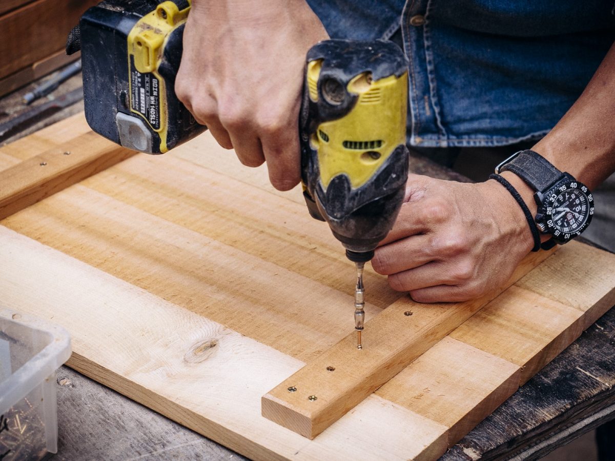 側面と同じように、底面も木工用ボンドで固定してからビットで穴を開け、ビスを打つ。これでボディの組立は完了。