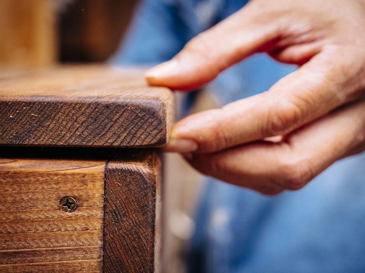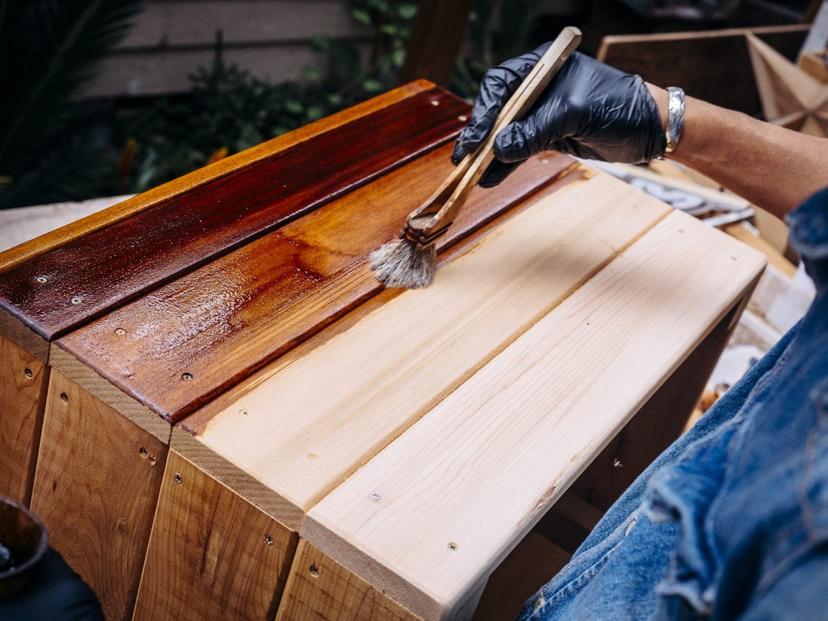 蓋をボディに装着する前に、木の温もりと味わいを引き出すワトコオイルを木目に沿って塗っていく。