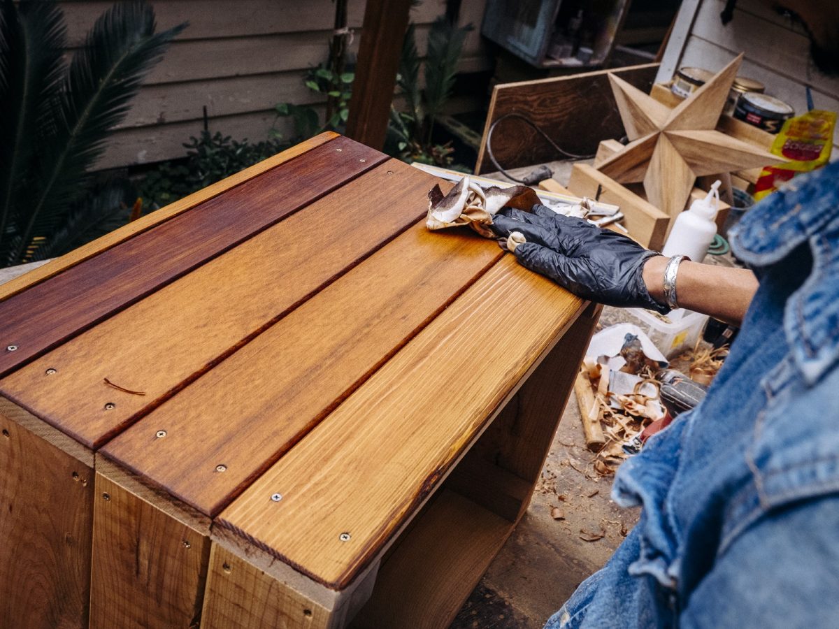 その後ウエスを使って余分なオイルを拭き取る。ダークウォルナットを使用。