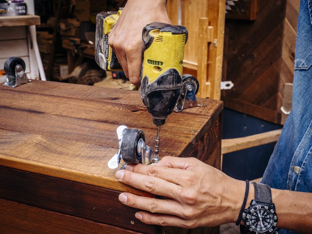底面にキャスターを装着する。キャスターは前2個を回転式に、後ろ2個を固定式にするとスムーズに動く。