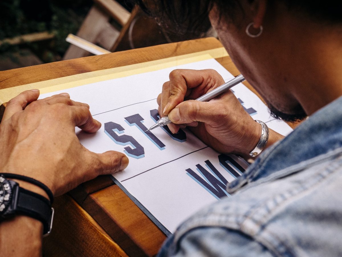 仕上げに文字をペイントをしてみる。あらかじめプリントしておいた文字入りの紙をマスキングテープで留め、その下にカーボン用紙をセットし、鉛筆で文字をなぞる。
