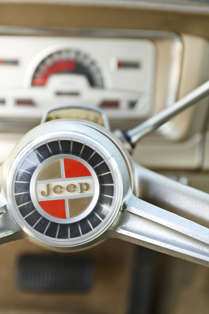 移行期らしいディテールのひとつが、ハンドルに付いたジープのロゴ。AMC のコーポレートカラーはトリコロールカラーであるが、カイザー時代から使われているオレンジとゴールドのカラーリングを継承しているのがおもしろい。