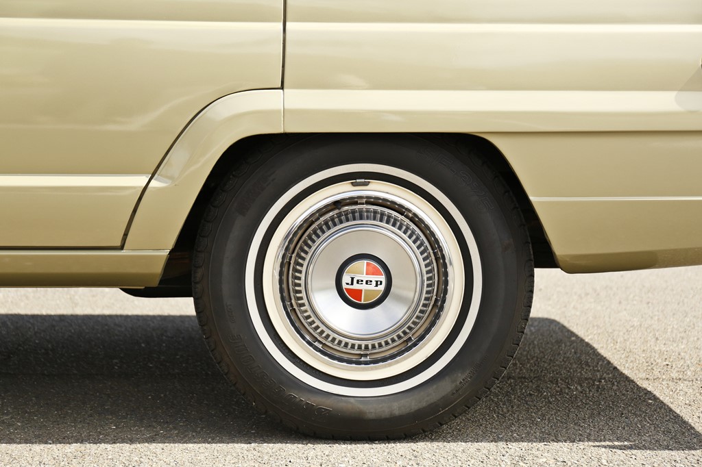 純正ホワイトリボンタイヤを合わせて、オフロードカーとの差別化を図っている。センターにあるジープのロゴは、カイザー時代のカラーリングを採用。この後に、AMC のコーポレートカラーであるトリコロールのデザインに変更される。