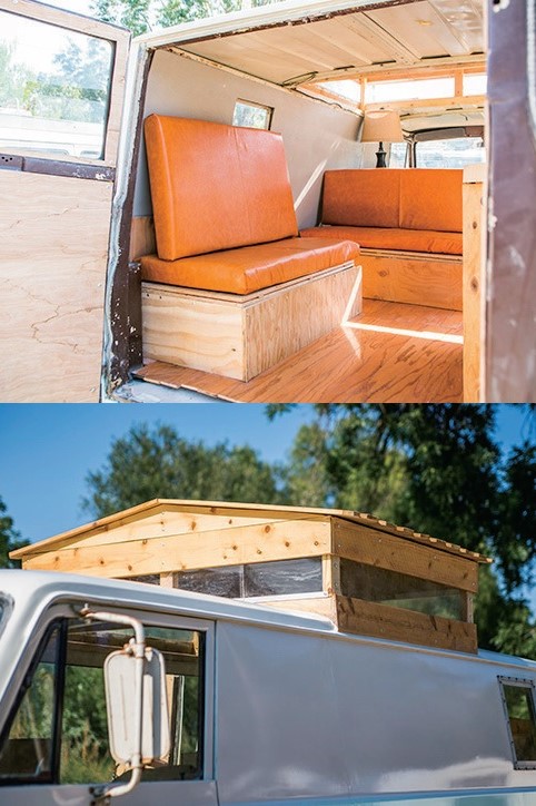 天井に穴をあけ、木とアクリルで仕上げた自作のウッドトッパー。内装のソファはフラットになり、ベッドとして使えるのは当然、その下が大きな収納スペースにもなっている。