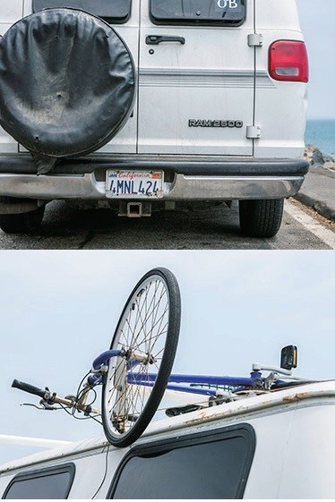 「本当は彼氏のクルマなんだけど、風邪をひいたから借りて海に来ちゃったの」というアランナさんのクルマはダッジのプロマスター。車内は彼が自作で作ったというキャンパー仕様になっており、サーフボードや自転車など、遊び道具がふんだんに積み込まれていた。