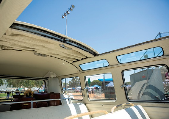 大きな開口部を持つサンルーフだけに、開けると解放感たっぷり。荷台に置かれたヴィンテージのトランクも雰囲気抜群!