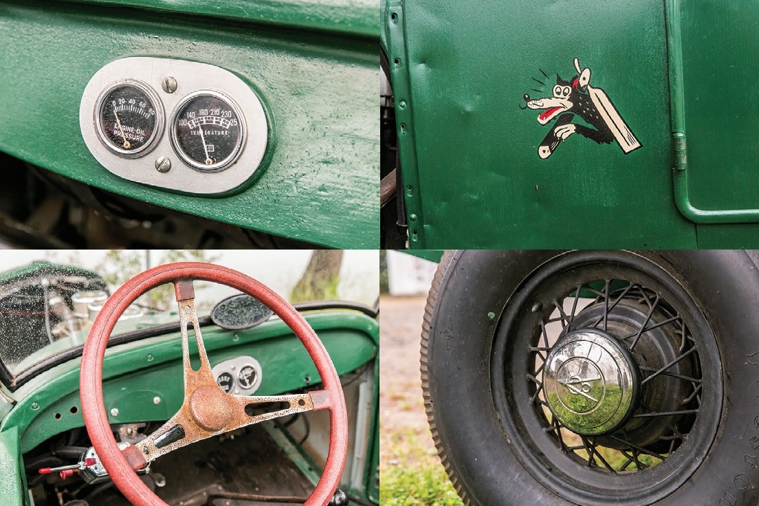 エンジンは1949年製であるが、ハンドルやミッションなどは、1927年当時のものを活かしている。クラッチがかなり重たいので、渋滞中はまるで筋トレのようになるのもご愛嬌。シンプルなインパネ周りも純正を活かしている。ホイールもキャップも当時のものを使用。車体はオールペンしてあるが雰囲気あり。