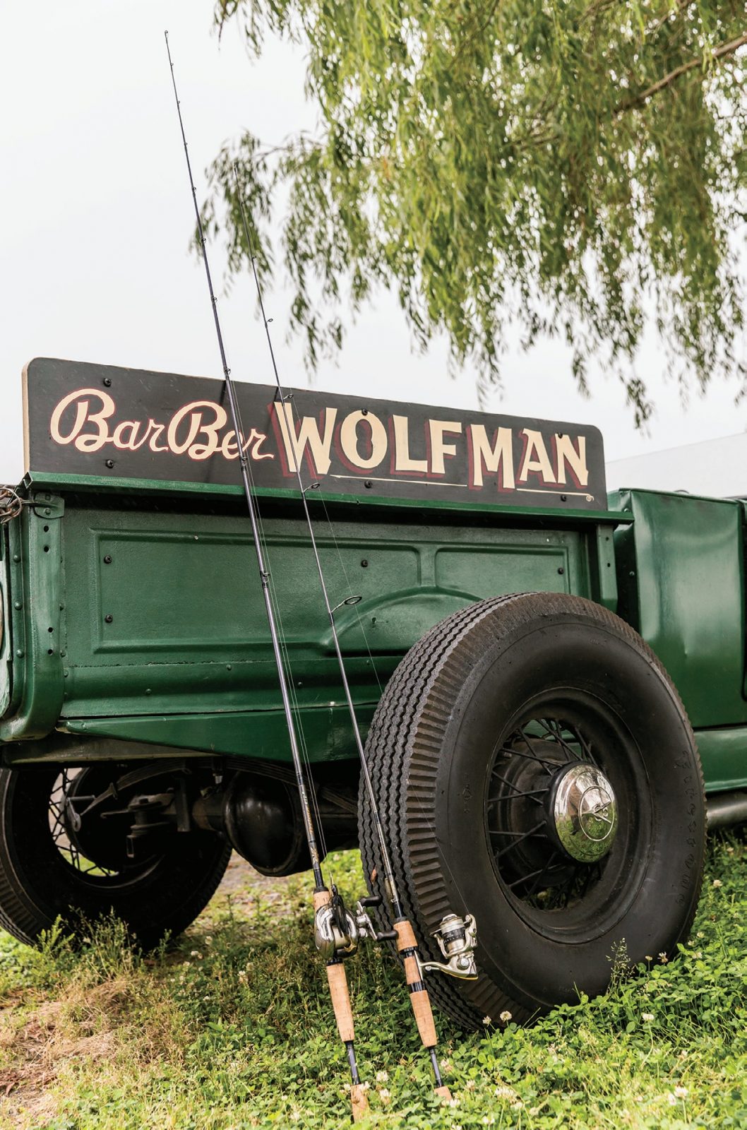 荷台のウッド製の柵には、ウルフマンバーバーのペイントが入っている。これもアーティストのスケッチさんによるもの。愛用のロッドはフェンウィック。