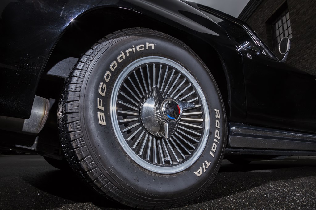 今となっては非常に貴重なC2に純正採用されたスピナーホイール(センターロック式ホイール)。タイヤはBF Goodrichの215/70-15を履く。