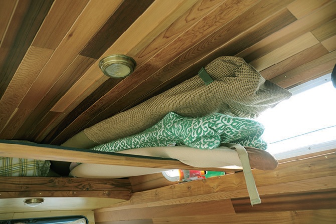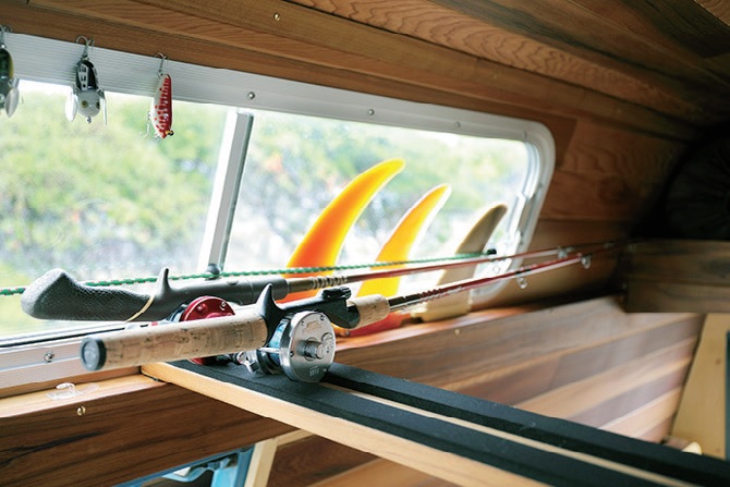 サーフボードや釣竿は、スペースを圧迫しないようにルーフの部分に柱をかけて収納している。柱の上にはクッションが配されるなど、道具を傷つけないための工夫がなされている点もさすが。