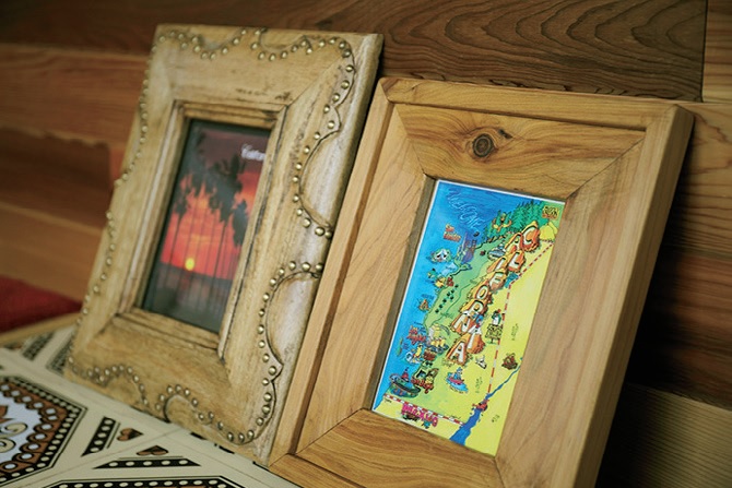 額装された海を匂わすアートは、車内のウッディな雰囲気と相性抜群。西海岸のサーファーたちのクルマでよく実践されているテクニックだ。