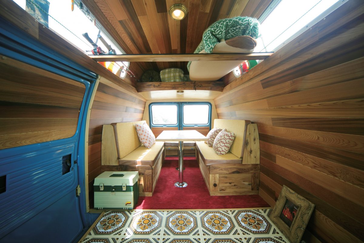 無駄なものが一切ない車内は、壁・天井の木張りや棚、ソファ、テーブルなどすべて自作。素人が作ったとは思えない完成度。ペイズリー柄が描かれる’70sのクッションフロアと赤い絨毯のコントラストもクールだ。