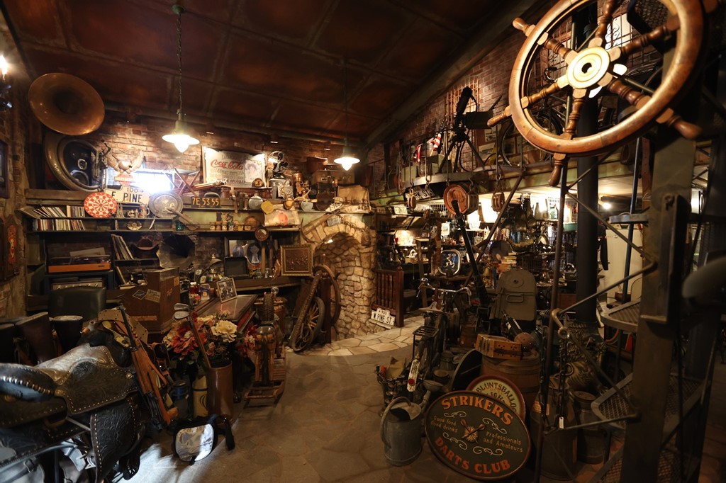 塚田さんのミリタリー愛はクルマだけでは収まらない。ガレージに続いて事務所を見せていただくと、そこには不稼働の実銃や制服、ヘルメットやキャンプ道具などありとあらゆる米軍グッズが並んでいる。仕事で造形モルタルやデザインコンクリートを駆使した内装を手がけるだけに、その全ての部屋がコンセプトごとに分けられた空間として作り込まれていて、映画の特殊な撮影スタジオのような部屋がいくつも続いている。
