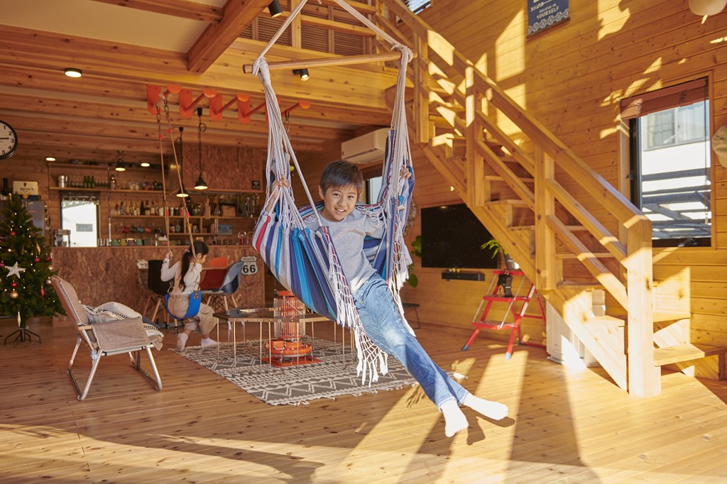 「家の中にはハンモックやブランコもあるし、友人の子供達には、この家はテーマパークみたいに映るみたいです(笑)。フルオープンサッシュを開ければ、リビングとウッドデッキが一体となるので、本当に気に入っています。ウッドデッキも含めて、広いリビングなんです」