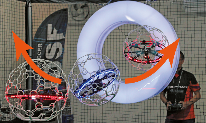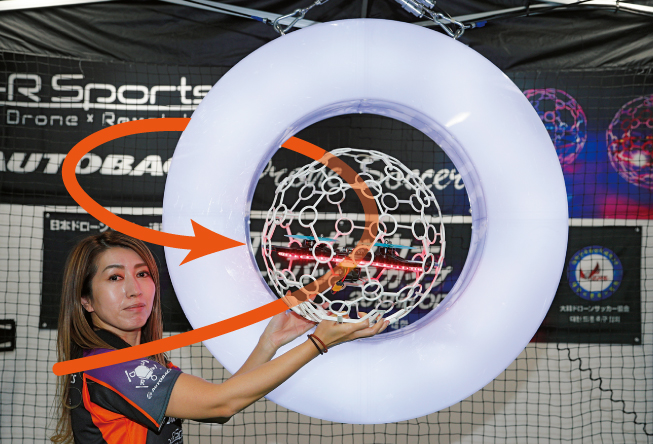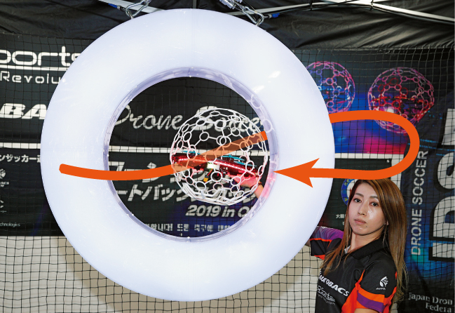 次は機体をゴールの輪にくぐらせ、写真のように横方向に8の字を描く練習をしよう。先ほどの円を描く練習とは違い、奥行きを意識しなくてはいけないので難易度は高い。この動きをマスターできれば、ゴール前の攻防で相手に弾き飛ばされた場合でも、即座に元のポジションに機体を戻すことが可能になる。