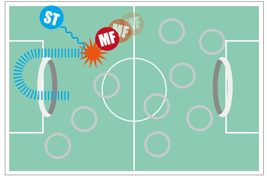 ストライカーが点数を入れた場合、味方の全機体が一度センターラインまで戻らなくてはいけないルールがある。この時、ミッドフィルダーは慌てずに相手ストライカーの動きに注目し、機会を伺う。
