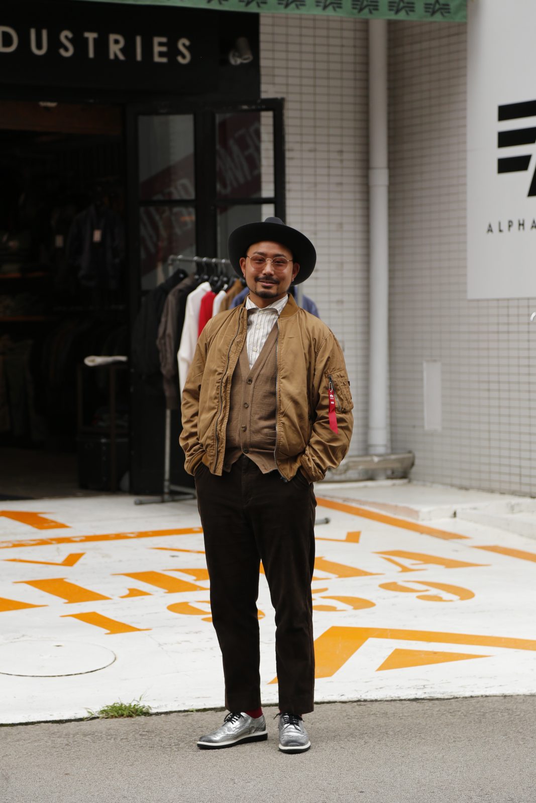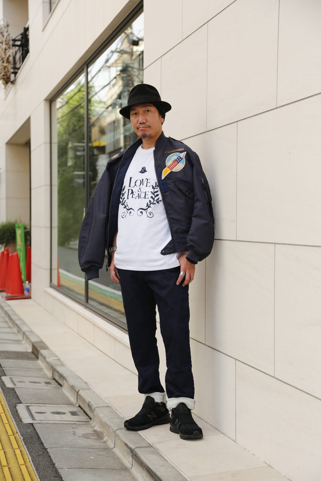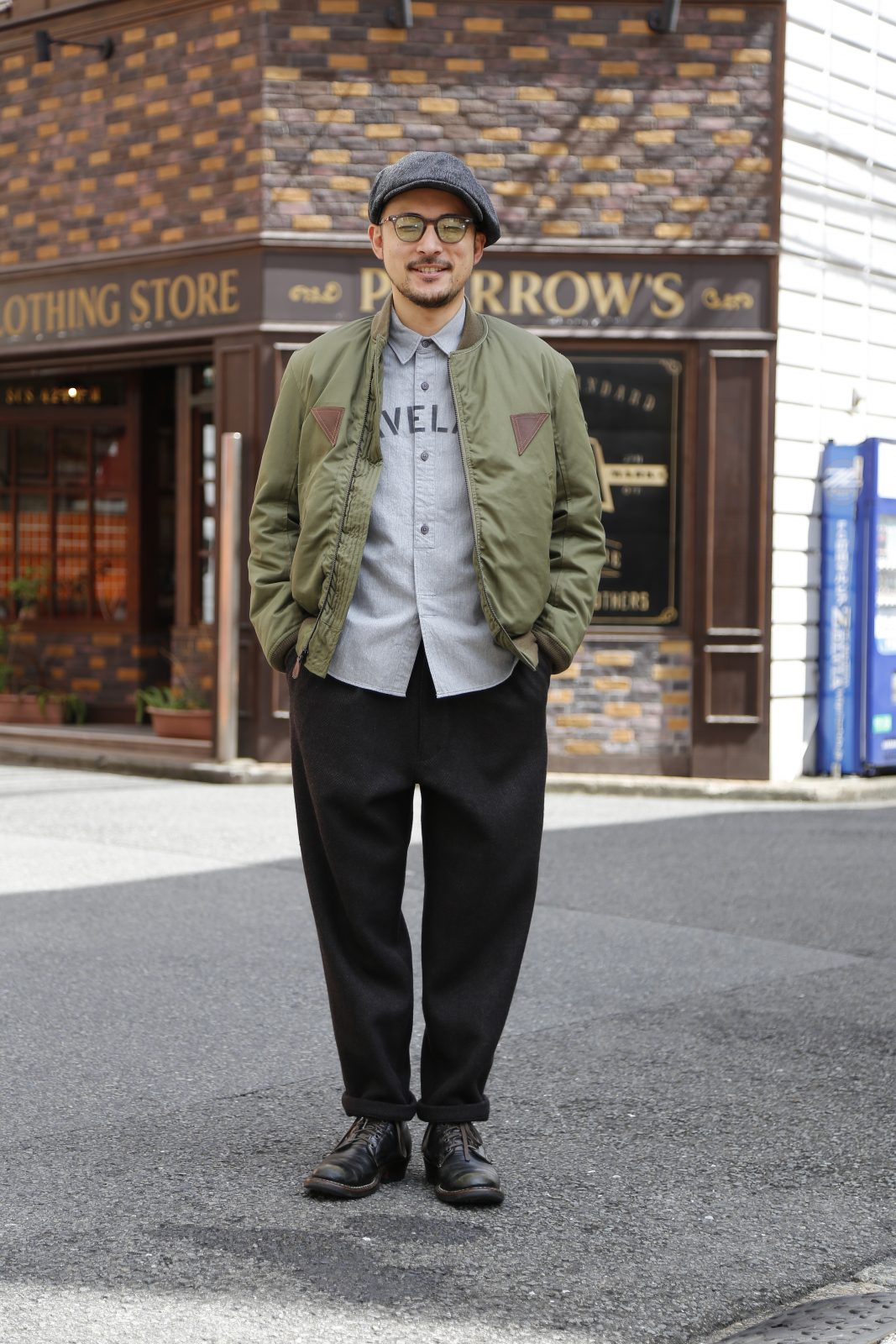 福島の名店JOB314の坪井さんは、薄手のL-2Bをビッグサイズで着こなした好サンプル。ボトムスも太いコーデュロイパンツをチョイスし、全体をルーズなアイテムで構成している。またアイテムの色数を押さえることでコーディネイトに統一感が生まれている。