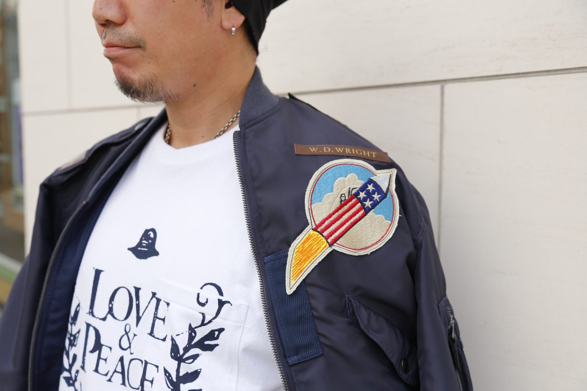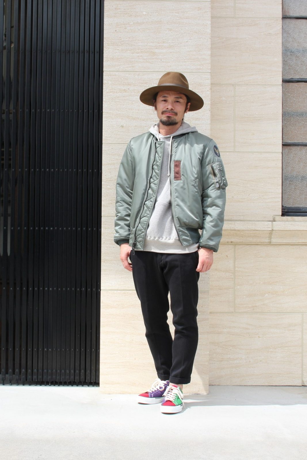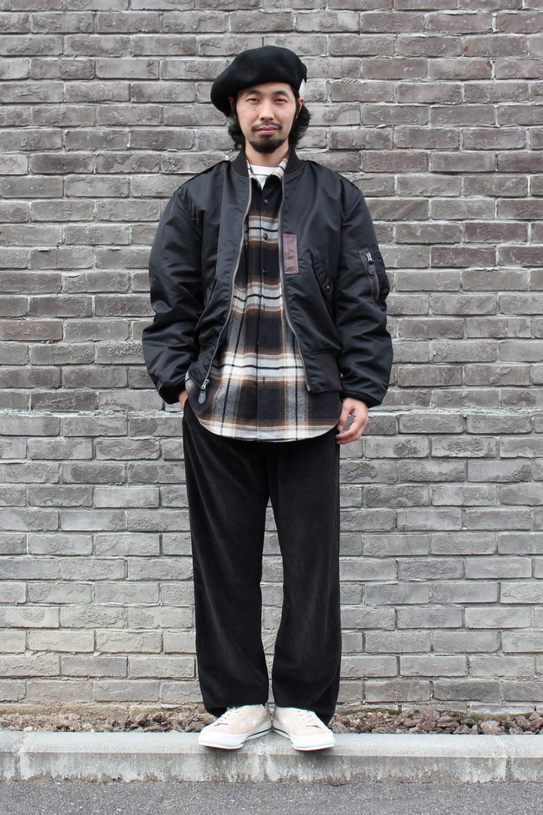 福島の名店JOB314の坪井さんは、薄手のL-2Bをビッグサイズで着こなした好サンプル。ボトムスも太いコーデュロイパンツをチョイスし、全体をルーズなアイテムで構成している。またアイテムの色数を押さえることでコーディネイトに統一感が生まれている。