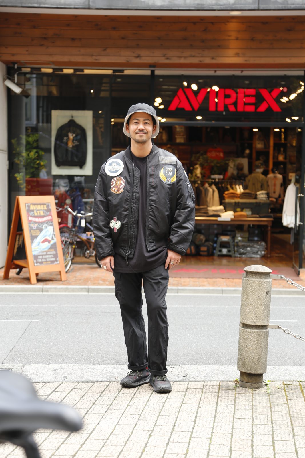 定番のMA-1をベースにトップガン仕様のワッペンが縫い付けられた新作をチョイスした寺島さん。オーバーサイズに加え、全アイテムをブラックで構築しているため、バランスも取りやすくストリート感もプラスしている。