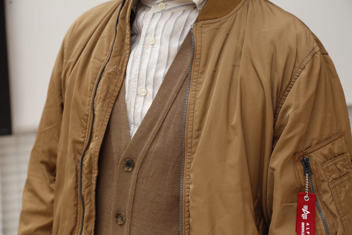 今季の新色であるコヨーテカラーのL-2Bを主軸にブラウン系のトーンでまとめた秋らしいコーディネイト。カーディガンやテーパードシルエットのパンツなど、上品なアイテムを使うことでカジュアルなジャケットを際立たせるテクニックを披露してくれた!