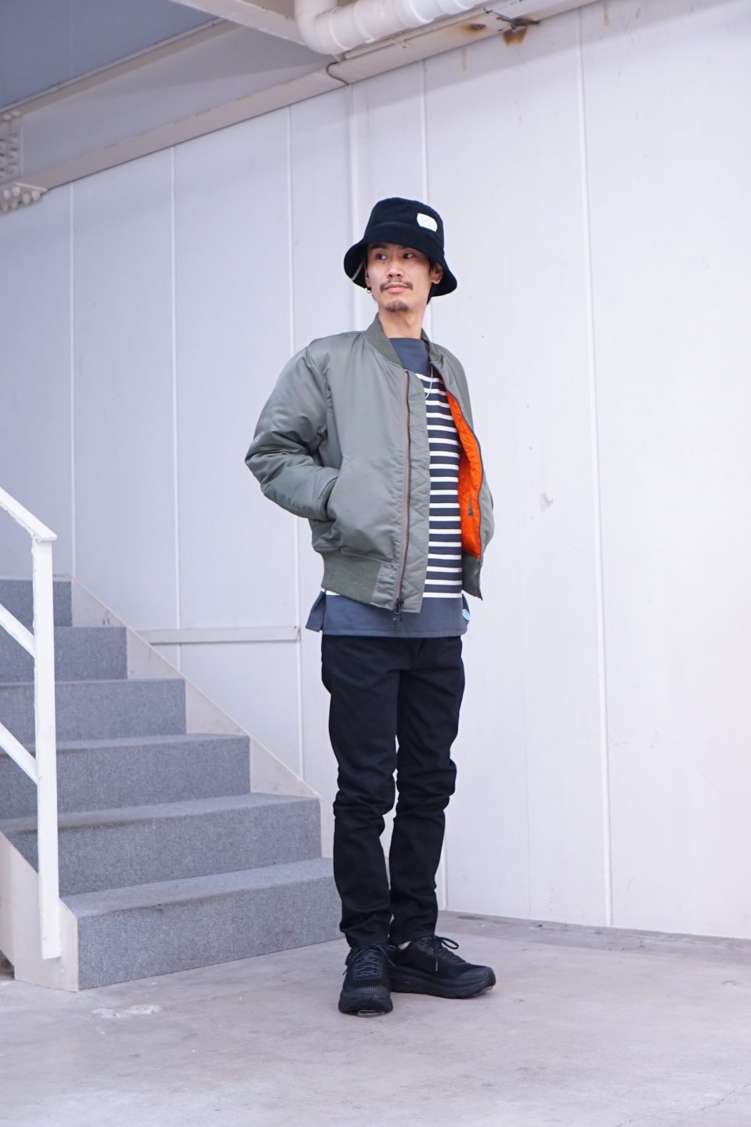 リアルマッコイズのMA-1に黒のテーパードパンツを合わせたシンプルなコーディネイト。ブリムハットやクレイジーカラーのスニーカーなど、印象的な小物を取り入れてスタイリングにスパイスを加えているのがポイントだ。